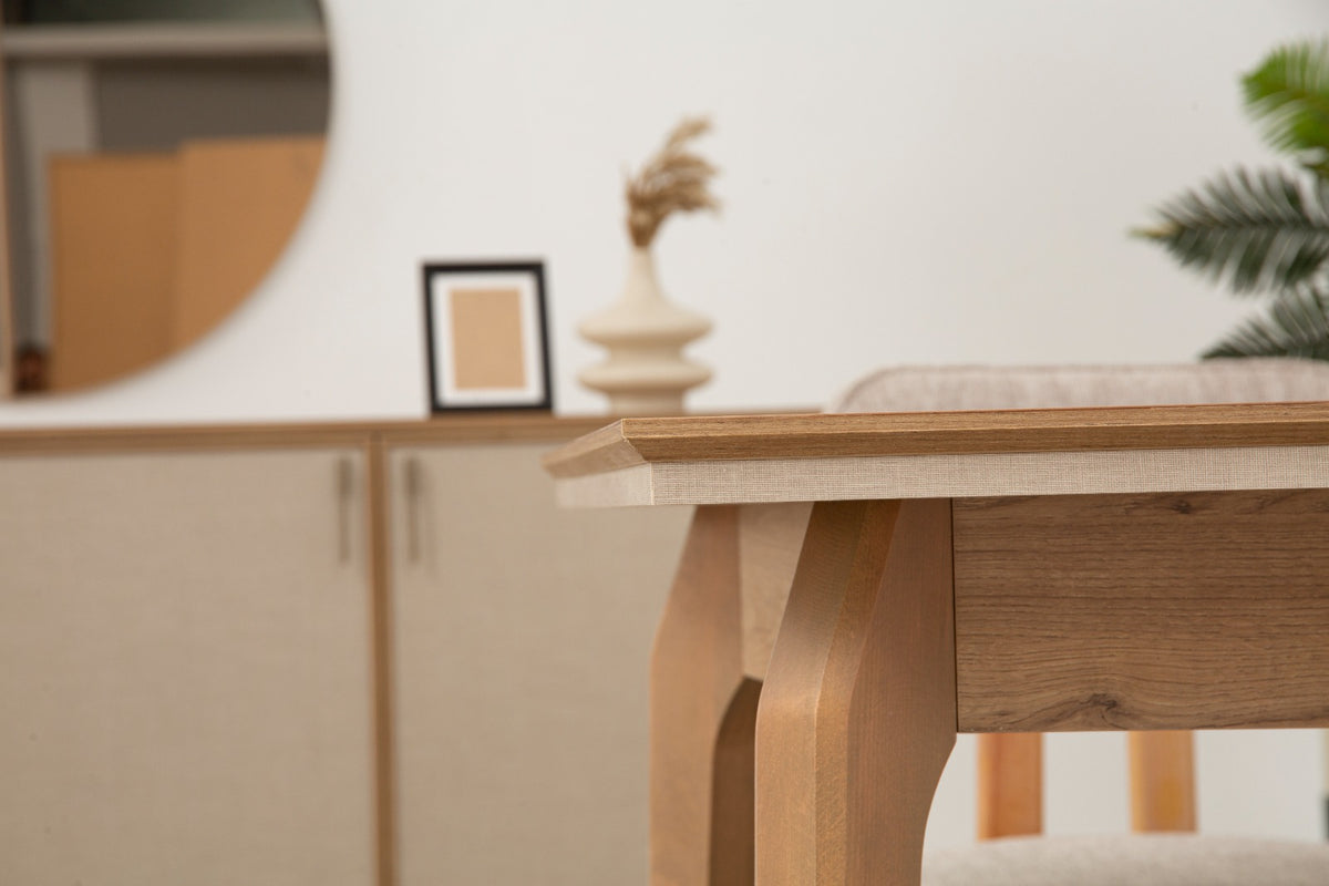 Ahşap malzeme ile üretilmiştir. Masa açılıp uzama özelliğine sahiptir.